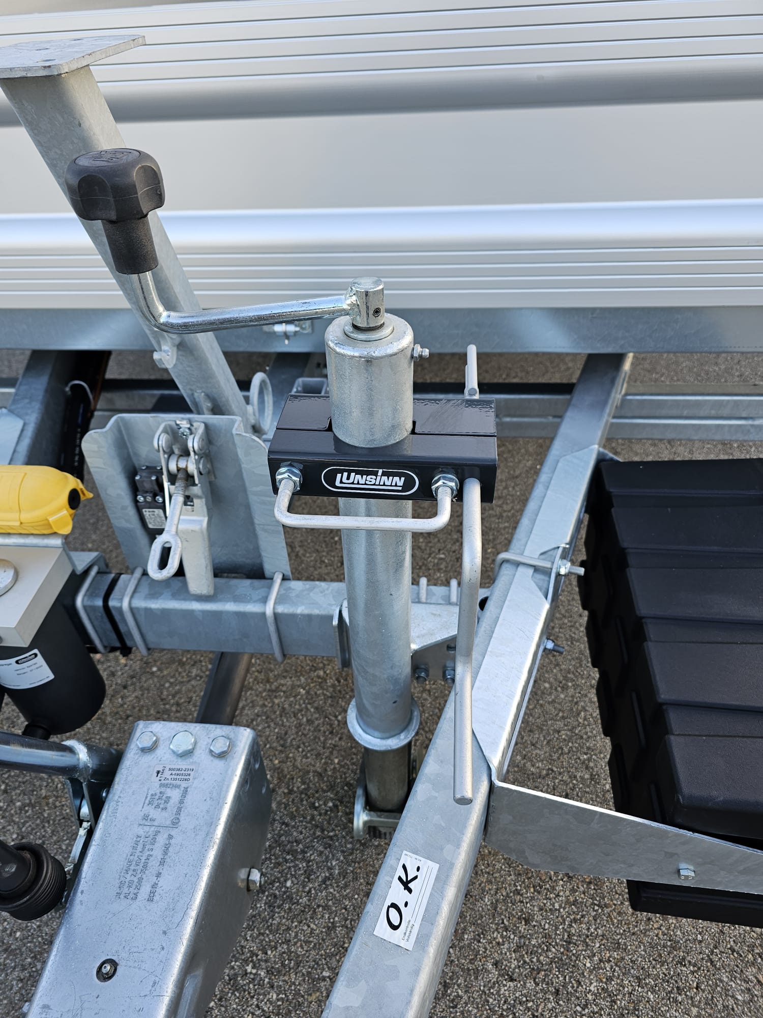 • Verstärktes, an einer separaten Quertraverse montiertes Automatikstützrad mit einer Tragkraft von 500 kg für sicheres Abstellen des Anhängers