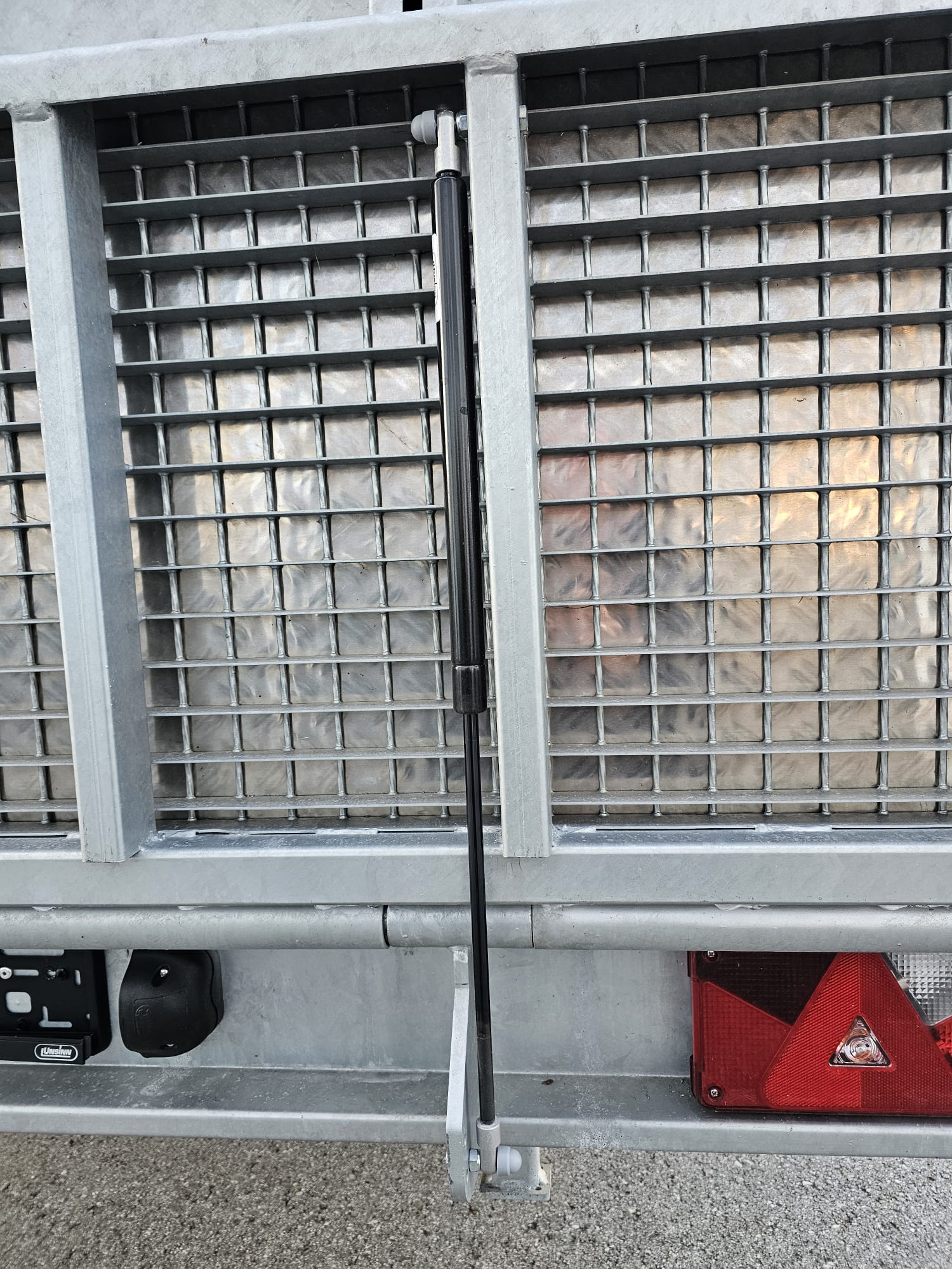 • Massive, 850 mm hohe Stahlgitterauffahrrampe geschlossen mit Alu-Riffelblech und Gasfederunterstützung über die gesamte Anhängerbreite für einfaches Öffnen & Schließen